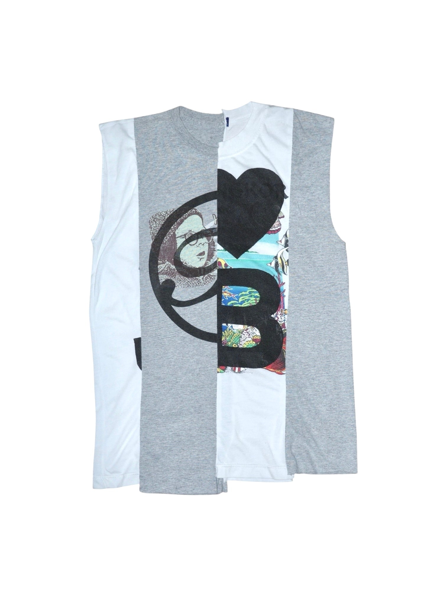 Each piece is deconstructed from two vintage tees, finished with custom screen prints, and reassembled into new silhouettes — a collision of graphics, styles, and textures.